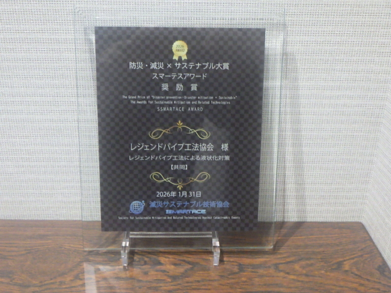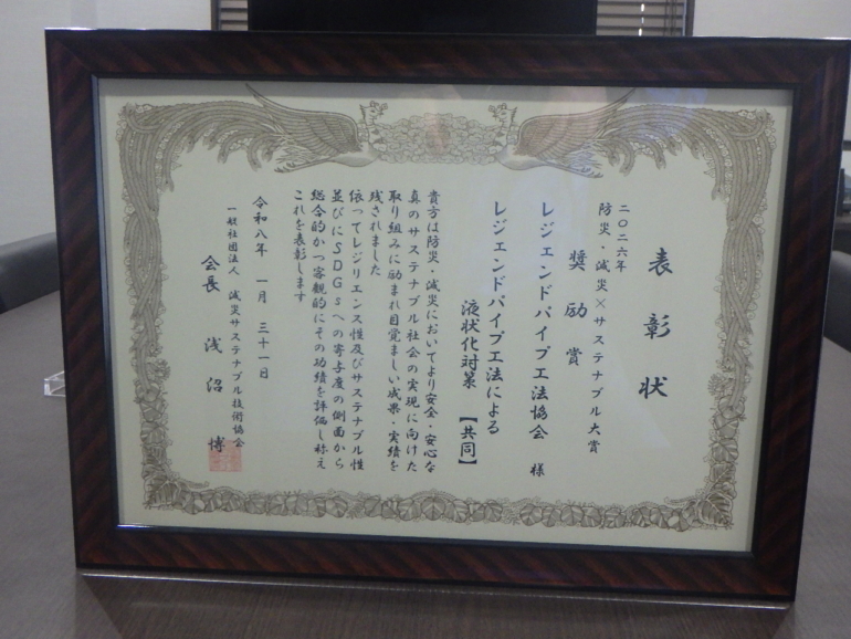本賞は、防災・減災の推進や持続可能な社会づくりに貢献する技術および取り組みを対象に選考されるもので、レジェンドパイプ工法の技術的有効性と社会的価値が高く評価されました。
